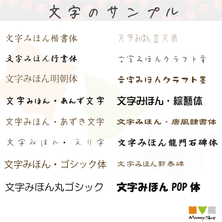 作成書体 明朝体・ゴシック体・行書体・丸ゴシック体・楷書体・POP体・あんず文字等での作成でございます。