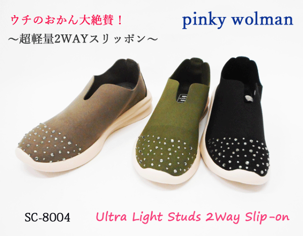 > 商品説明素材アッパー:人工皮革 底材:合成底 サイズS 23.0cmM 23.5cmL 24.0cmLL 24.5cm 商品紹介 pinky wolmanの高性能スタッズスリッポンかかとが踏めてバブーシュとしても履けます。