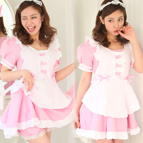 ■可愛いピンクのメイドさんコスチューム5点セット(制服)ペチパン フリルパンツ カチューシャ/lun57【ステージ ウィッグ 発表会 ベビードール 過激 浴衣 祭り 仮装 ハロウィン ステージ マキシ ガウン パーティ カラコン ボディコン ヒール イベント ダンス】